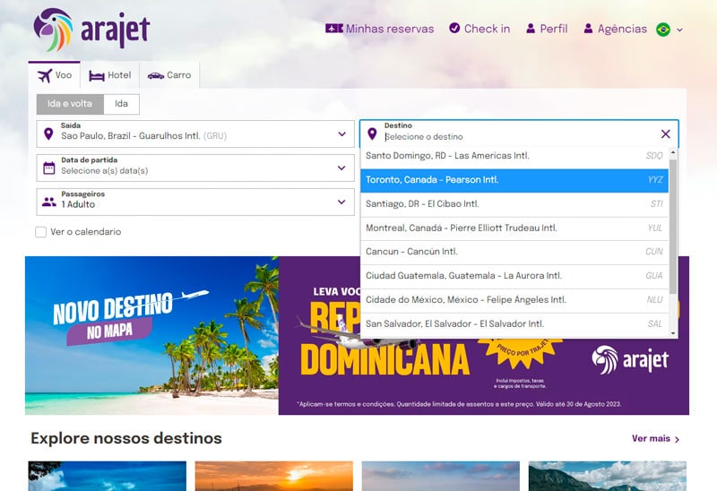 Para começar com o pé direito no Brasil, a Arajet já lançou uma super promoção de passagem aérea saindo de São Paulo para Toronto a partir de R$ 1.386, valor de ida e volta com taxas inclusas. (Esta já encerrada)