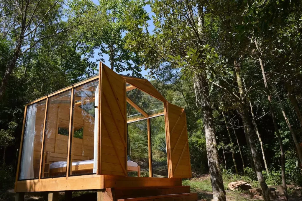 Já imaginou se hospedar em uma cabana feita praticamente inteira de vidro? Poder observar a natureza e dormir sob as estrelas? Essa é a proposta da Cabana no Vale das Furnas na cidade de Alfredo Wagner.