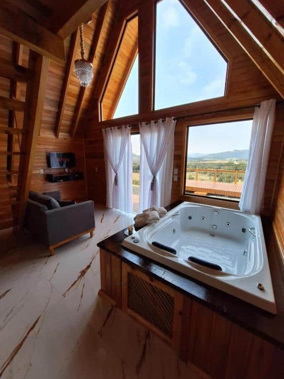 Uma novidade em nosso parceiro Booking, a Altitude máxima – Cabanas de Altitude é uma opção de cabana super completa para quem quer viajar bem amparado. As cabanas possuem quarto, banheiro privativo, sala, cozinha completa e ainda banheira de hidromassagem e amenidades, como roupão e chinelos.