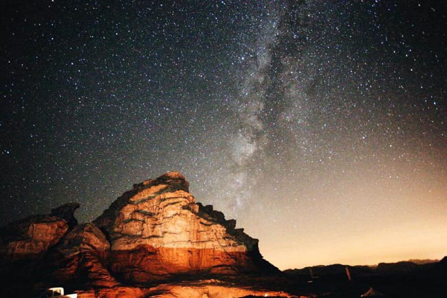 No meio da imensidão, o silêncio reina. Longe da urbanização, ao cair da noite nota-se o brilho das estrelas, que formam uma bela constelação vista a olho nu. Para aproveitar ainda mais essa experiência, o ideal é se alojar nos acampamentos locais, que oferecem não só tendas para dormir em pleno deserto, como uma verdadeira imersão na cultura e tradição, seja através da comida, da dança ou das histórias que os beduínos, árabes seminômades habitantes do deserto, contam. São eles que guiam os passeios (de camelo ou 4×4) e dão um show de hospitalidade.