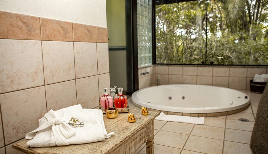 A suíte premium, categoria acima, além de todas as inclusões citadas, inclui uma banheira de hidromassagem com vista para a mata, comportando também até três adultos (em uma cama extra que pode ser montada).