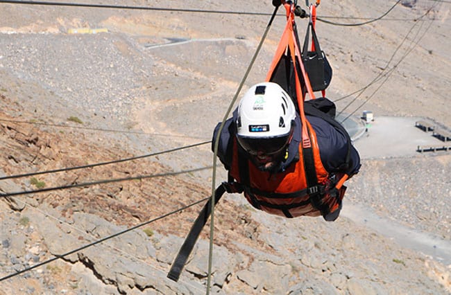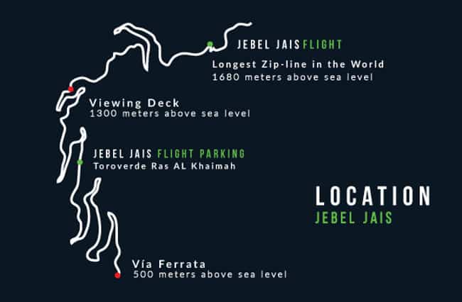 A atração fica na cidade de Ras Al Khaimah, na fronteira com Omã, que está ao poucos se desenvolvendo na área de turismo para se tornar cada vez mais um destino de férias alternativo a Dubai. A tirolesa está inclusa como um dos chamarizes para visitantes e já recebeu o título de maior do planeta pelo Guinness Book, reconhecido como o livro dos recordes.