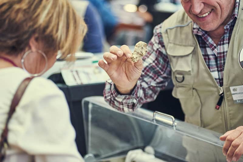 Vendedor apresenta trufa para possível compradora Crédito: Luca Privitera/Divulgação