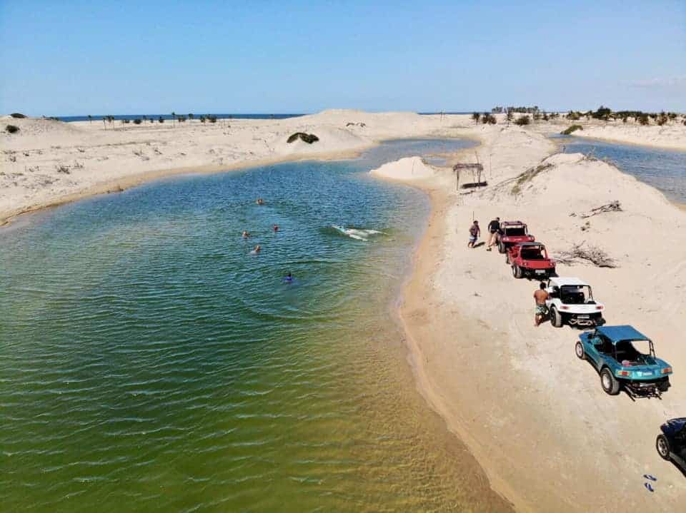 Os 20 quilômetros de litoral da antiga vila de pescadores reserva praias de águas turquesas, faixas de areia branquinha, coqueirais, mata nativa, arrecifes, piscinas naturais e dunas onde se formam as paisagens surreais dada a junção de resquícios da chuva com elevação dos lençóis freáticos na área próxima ao Parque Eólico.