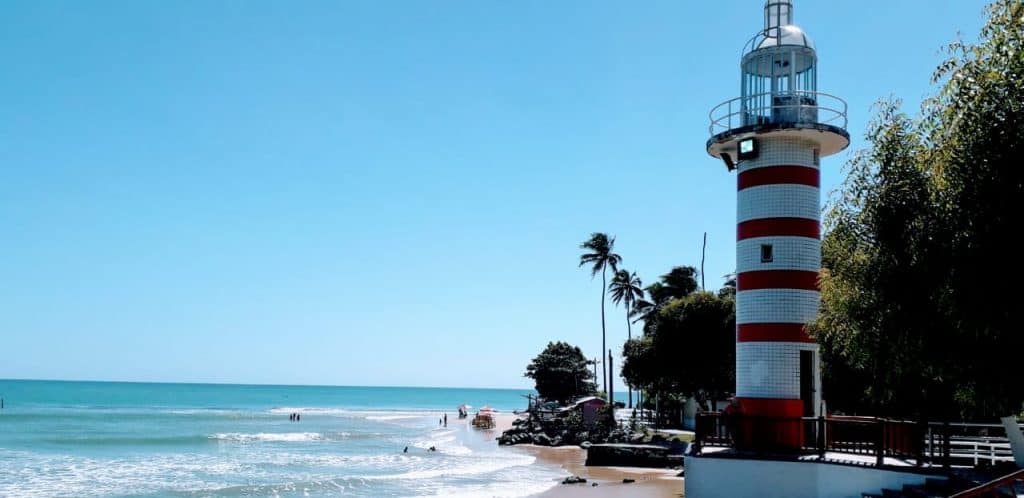 O farol listrado nas cores vermelha e branca indica que você chegou à Muguba, a principal praia de Paracuru. Lá do alto se observa a enseada em formato de meia lua, mais uma cena poética oferecida pela natureza da cidade.