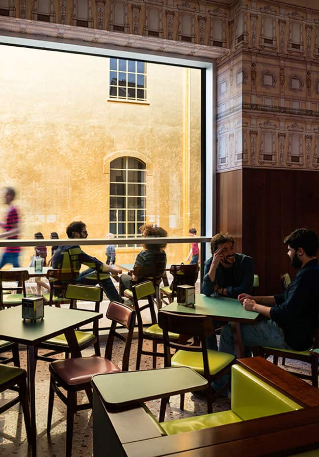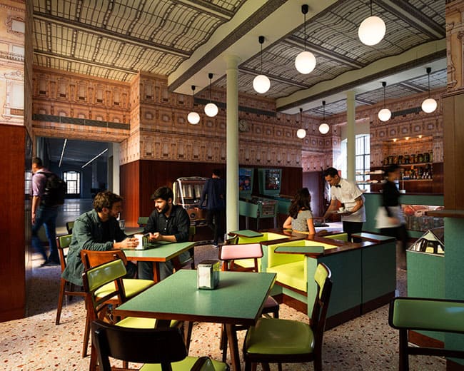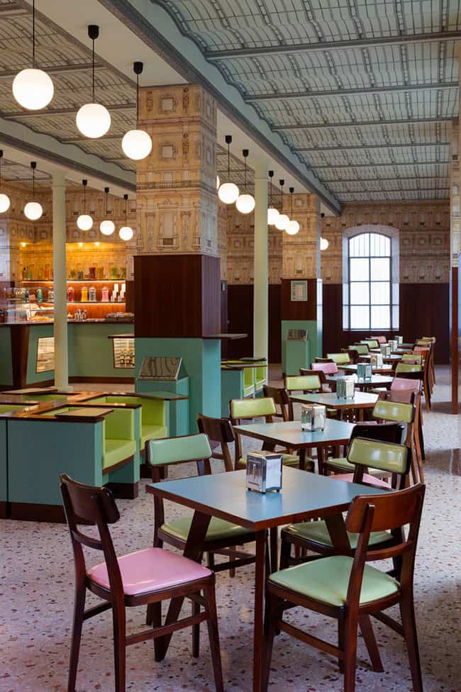 Alguns detalhes da arquitetura e da decoração originais da estrutura, dentro da Fondazione Prada, foram preservados. Os filmes italianos “Miracolo a Milano”(1951) e “Rocco E I Suoi Fratelli” (1960), serviram de inspiração para Anderson, que inclui tons pastel, móveis de fórmica, painéis de madeira e outros elementos que remetem ao neorealismo do país.